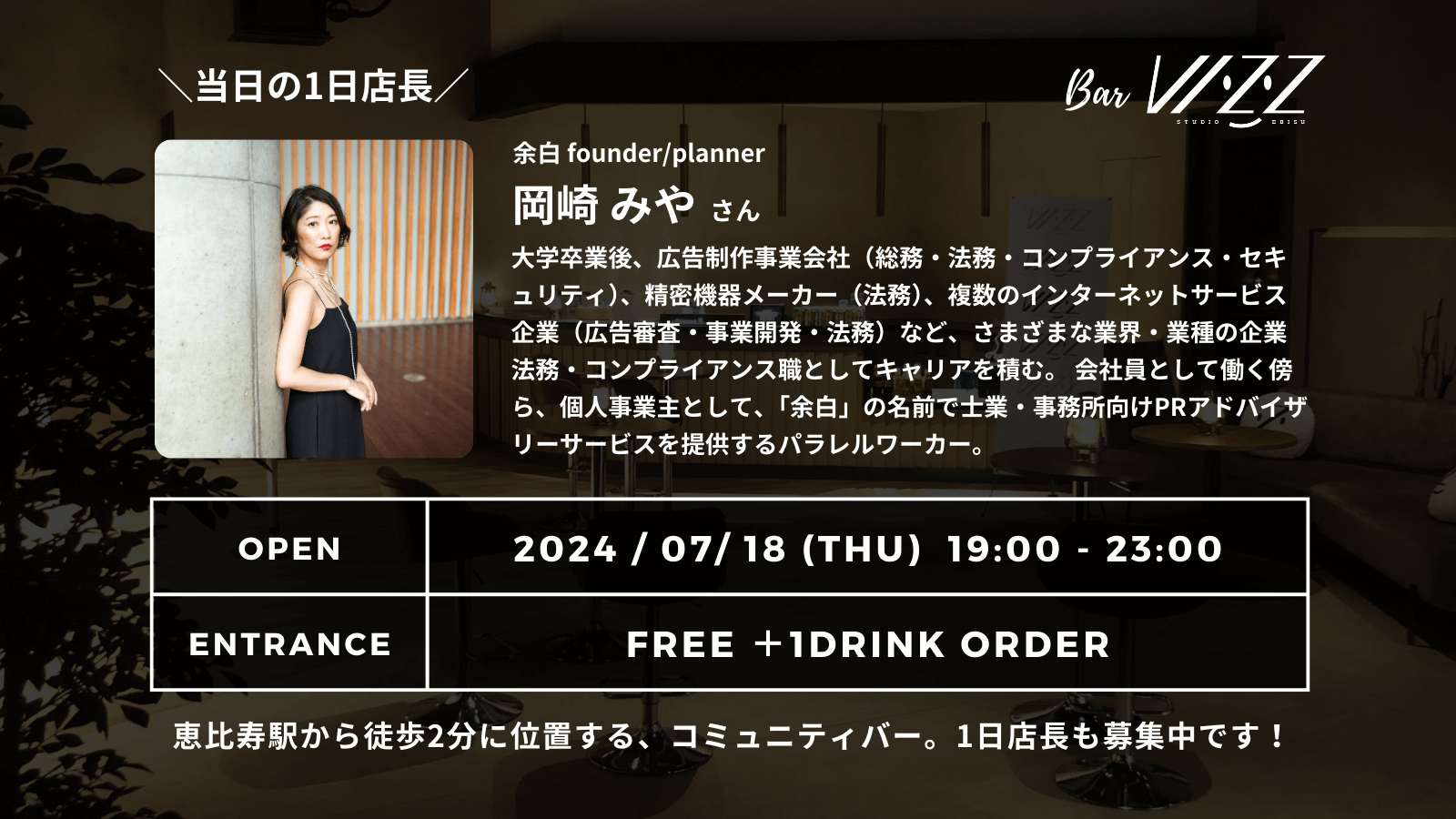 STUDIO VIZZ EBISUの新たな試みとして、2024年1月よりコミュニティバー「Bar VIZZ」をOPENしております。7月18日(木)は士業・事務所向けPRアドバイザリーサービスを提供する「余白」の岡崎 みやさんが1日店長を務めます!