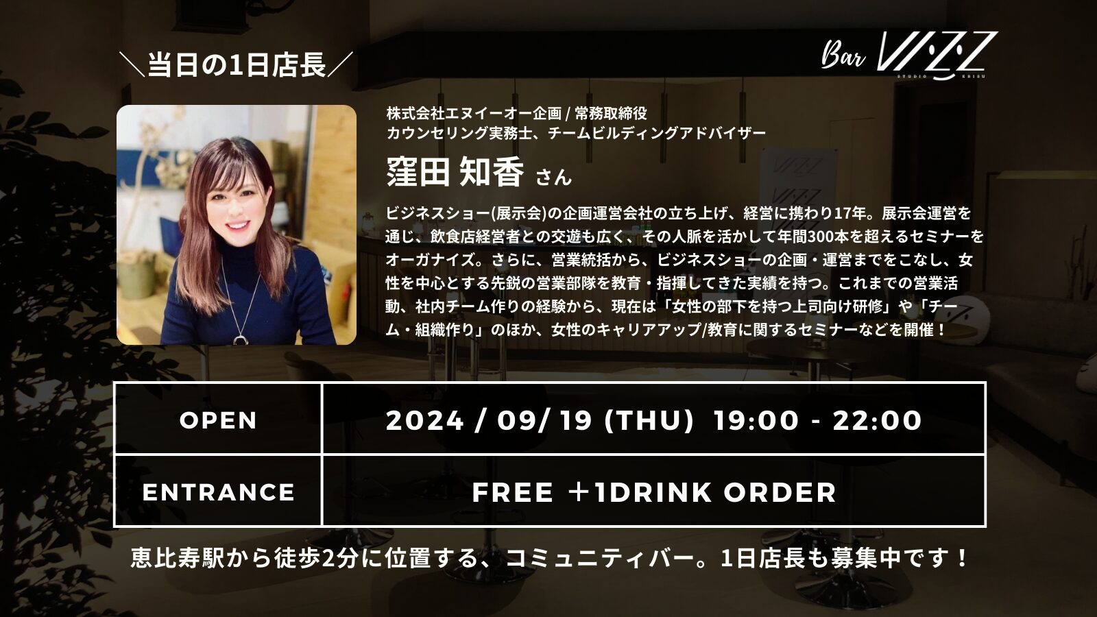 【9月19日(木)】Bar VIZZ 株式会社エヌイーオー企画 常務取締役 窪田知香さんが一日店長を務めます!