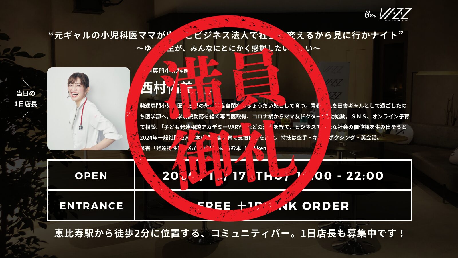 【10月17日(木)】Bar VIZZ「元ギャルの小児科医ママが出版とビジネス法人で社会を変えるから見に行かナイト」〜ゆみ先生が、みんなにとにかく感謝したいらしい〜西村佑美さんが一日店長を務めます!
