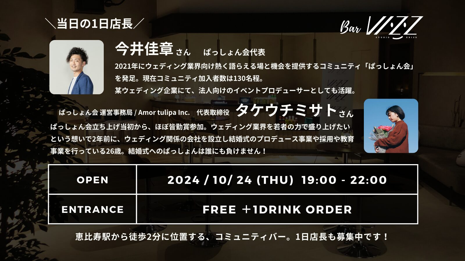 【10月24日(木)】Bar VIZZ ぱっしょん会代表の今井佳章さんとぱっしょん会運営事務局のタケウチミサトさんが一日店長を務めます!