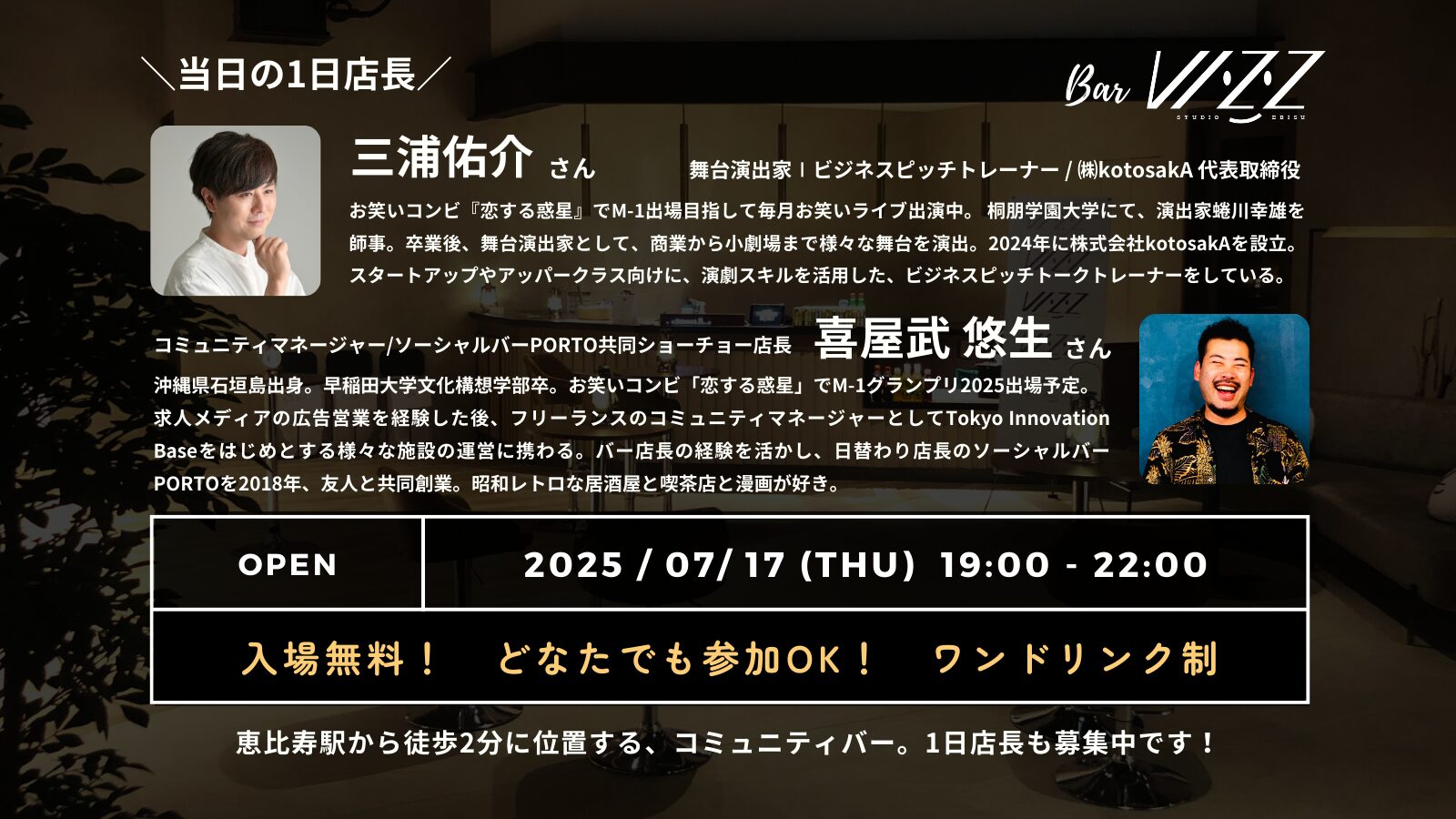 7月17日(木)は、舞台演出家とソーシャルバー創業者、